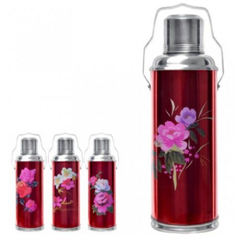 Термос в металлическом корпусе, покрытом красной эмалью с рисунком.Колба стеклянная, пробка изготовлена из бамбука, обтянутого тканью.Упакован в картонную коробку.