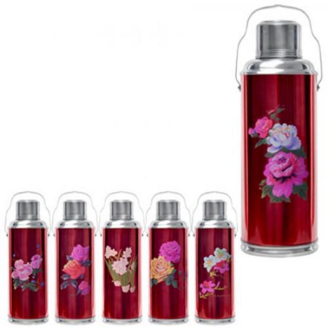 Проверенный временем металлический термос со стеклянной колбой.Сутки гарантированно держит температуру.Объем 2л.Корпус -металлический, покрытый красной эмалью с рисунком.Пробка изготовлена из бамбука, обтянутого тканью